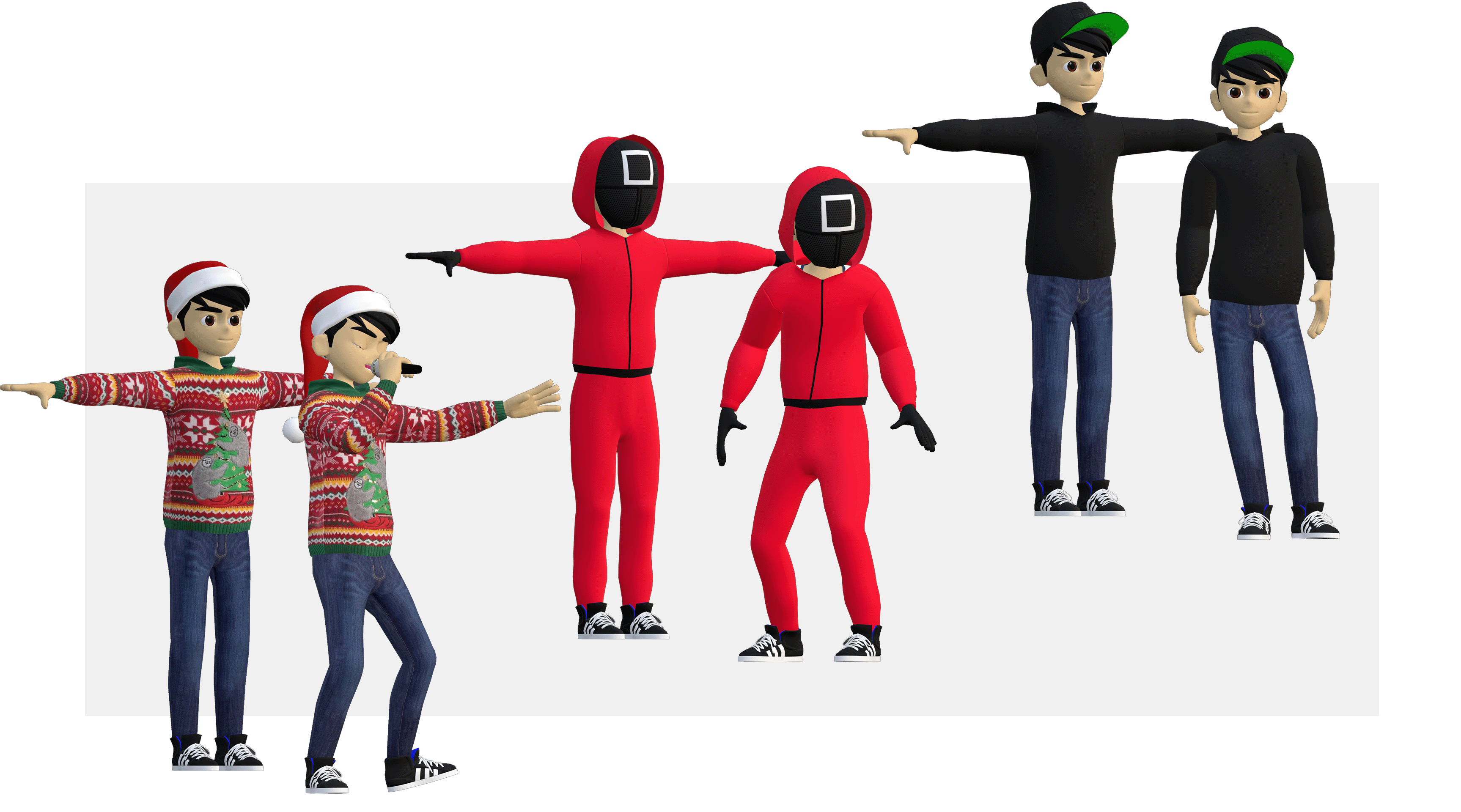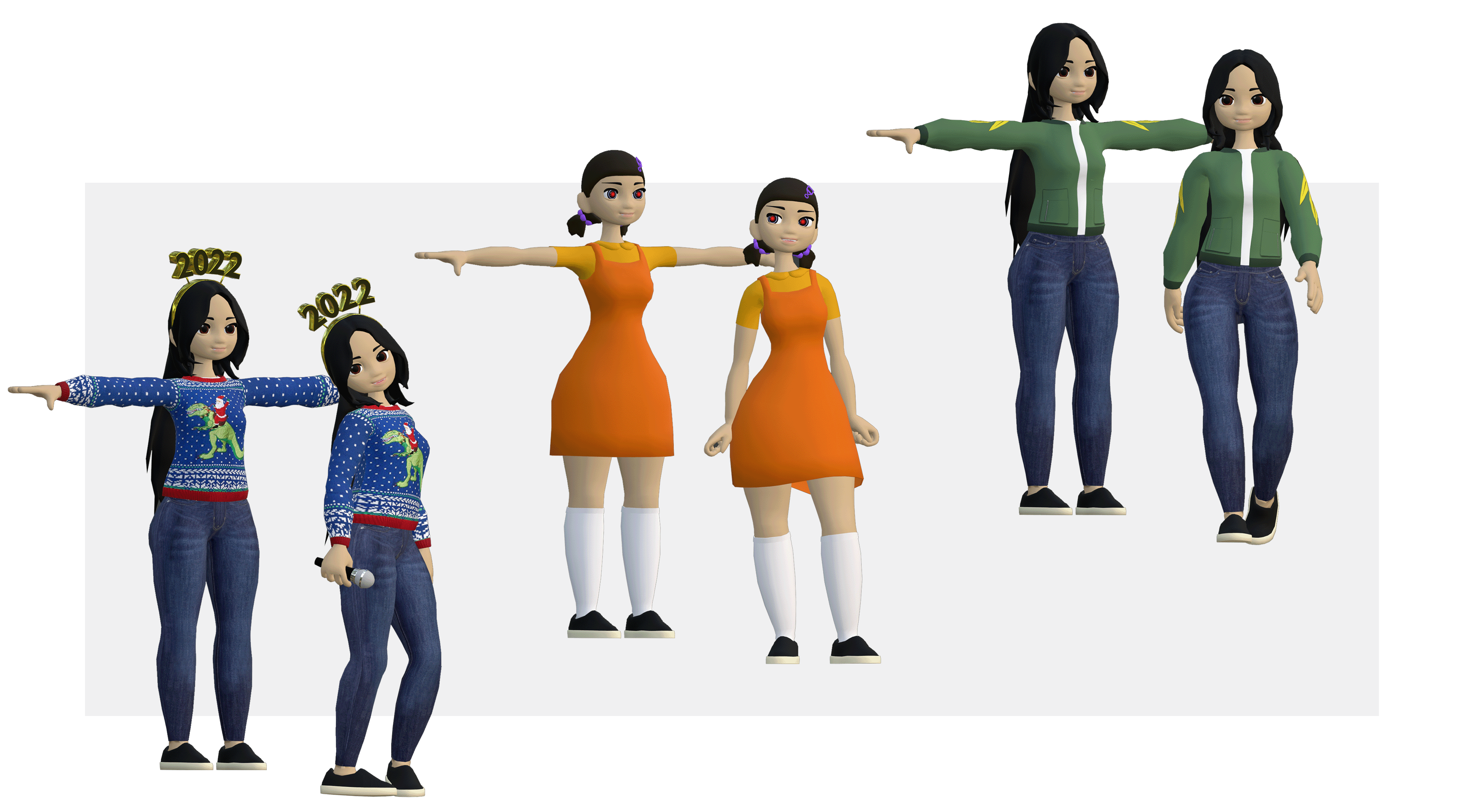 After the first set of avatars was complete, I was able to create relatively quickly some additional outfits that followed current trends. With a few extra lines of code in Unity its possible to change these outfits on-the-fly during live streaming.
