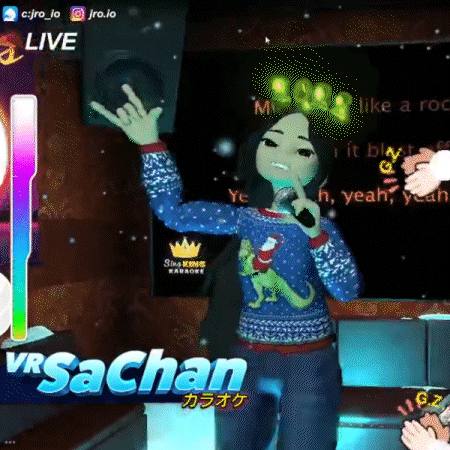 When enough gifts are sent by viewers, we enter "Star Power" mode where the entire room dissolves away into a whole new world depending on the season. We see here a winter wonderland during Holidays and New Years. Lyrics from the YouTube video can still be seen floating in the sky and highlighting as they're being sung.